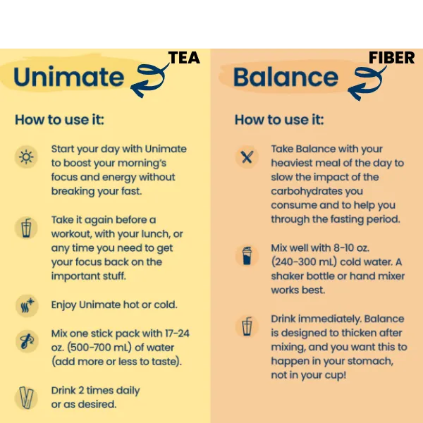 Unimate supports the body’s natural GLP-1 production, which helps you feel full for longer, and Balance adds much-needed fiber to support satiety further. These products work together to help stabilize blood sugar and reduce hunger, making it easier to extend the time between dinner and your first meal of the following day.